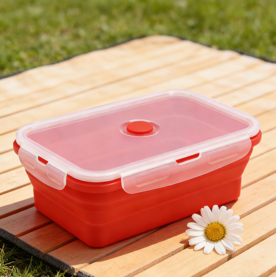 The silicone body expands fully for use and collapses after eating to reduce bulk.