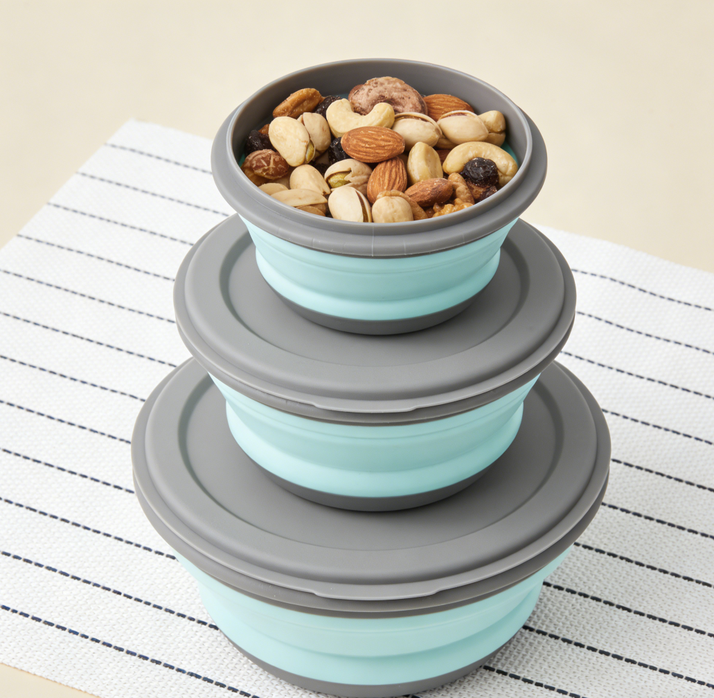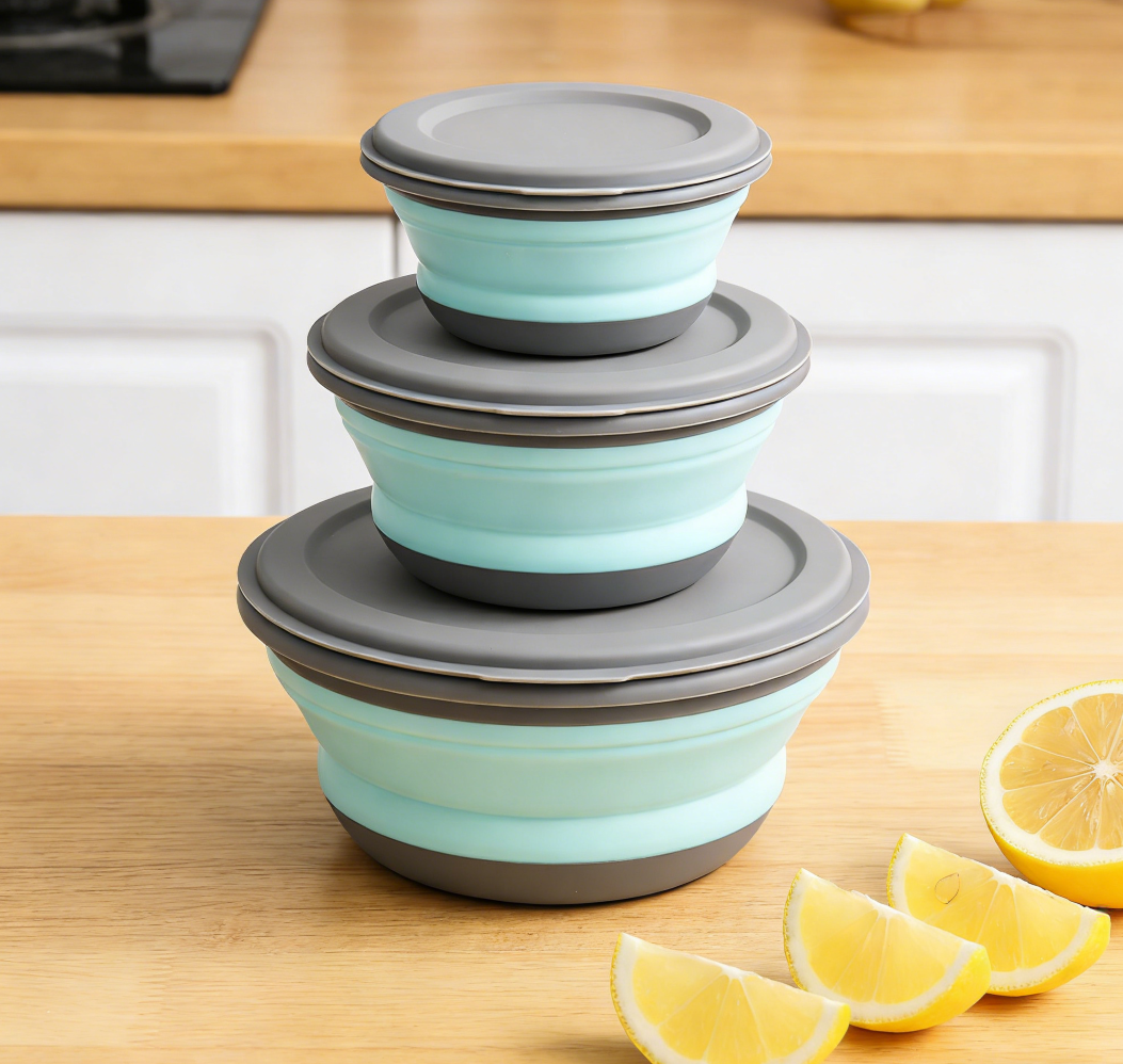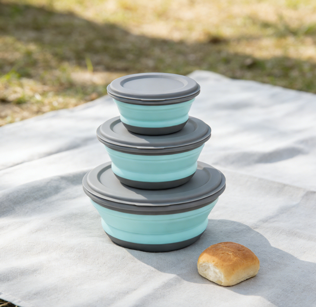 This portable bowl set includes three collapsible silicone bowls, each with a matching lid.