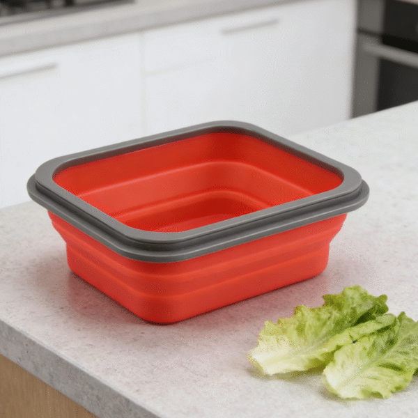 The collapsible silicone structure allows the container to be stored efficiently when empty.
