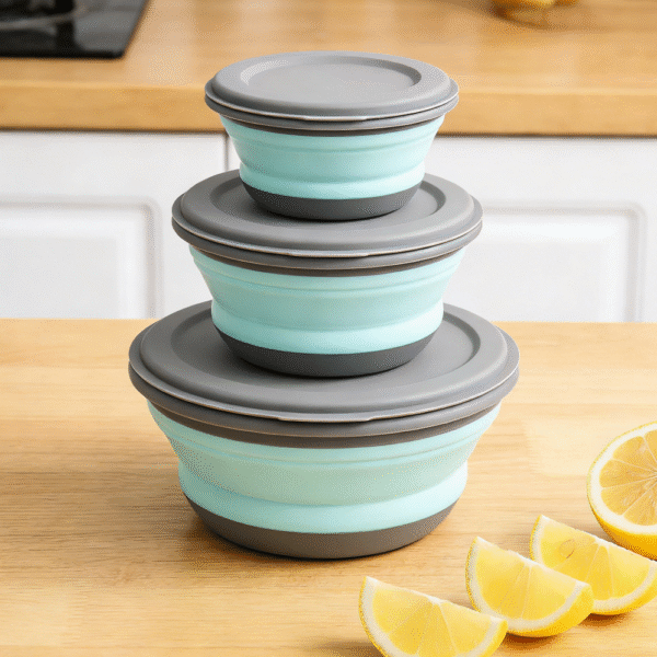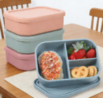 This four-pack silicone lunch container set features a stackable design for organized storage.
